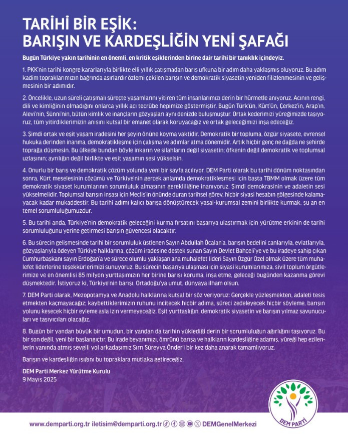 Tarihi bir eşik başlığıyla 8 maddeden oluşan açıklamada "DEM Parti olarak bu tarihi dönüm noktasından sonra, Kürt meselesinin çözümü ve Türkiye'nin gerçek anlamda demokratikleşmesi için başta TBMM olmak üzere tüm demokratik siyaset kurumlarının sorumluluk almasının gerekliliğine inanıyoruz" ifadelerine yer verildi.