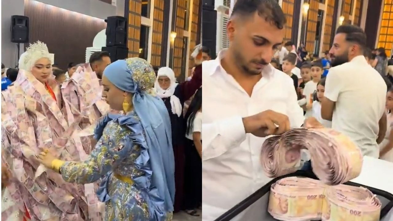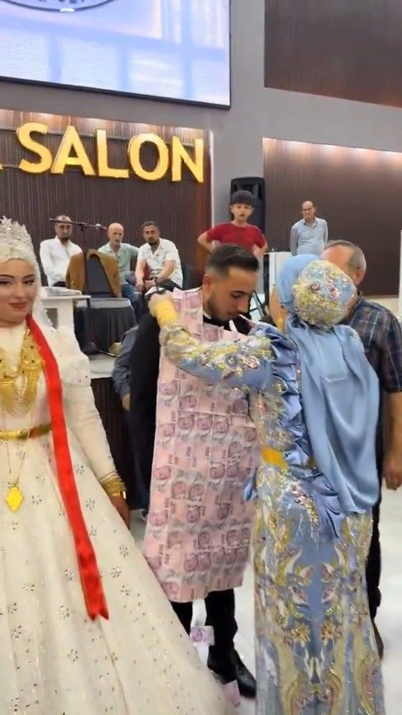 Mardin’in Kızıltepe ilçesinde yapılan bir düğünde, damada 200 TL’lik banknotlarla hazırlanmış yelek giydirildi. Düğün, renkli görüntülere sahne oldu.