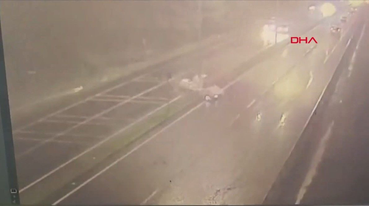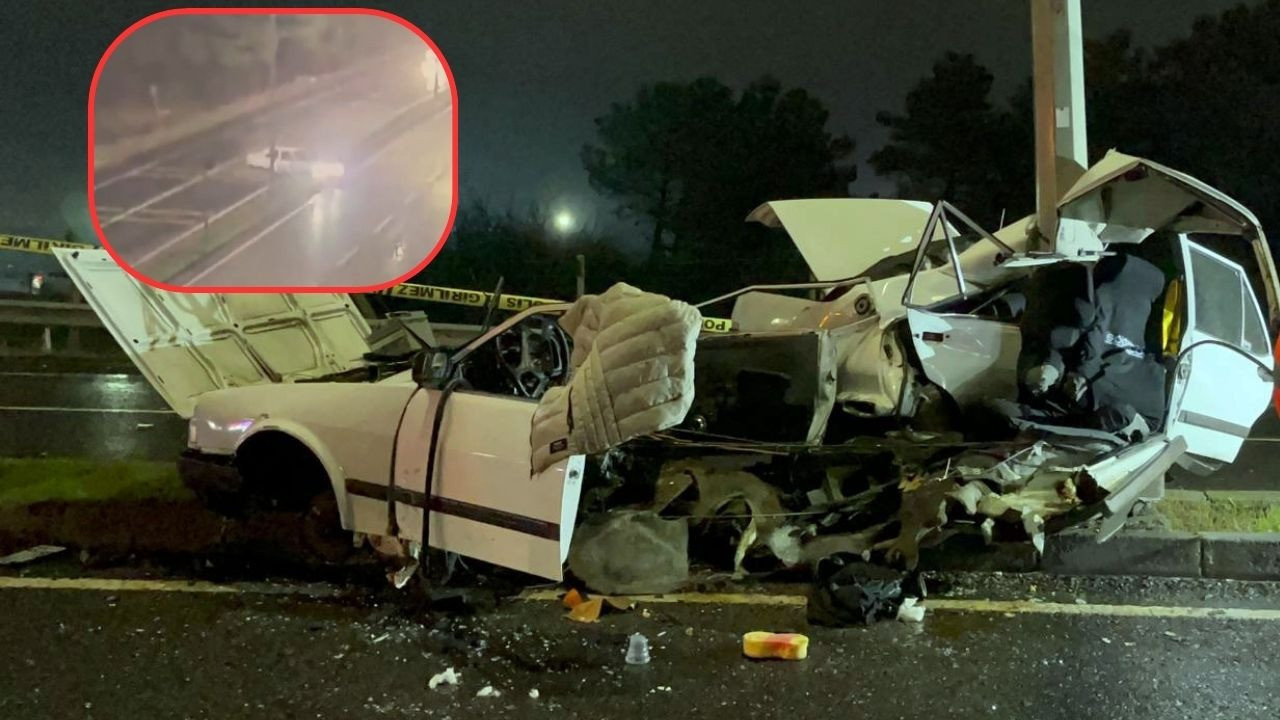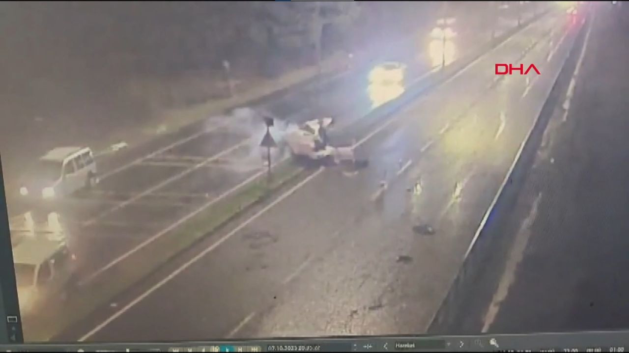 Görüntülerde, yolda savrulan otomobilin aydınlatma direğine çarptığı ve çarpmanın şiddetiyle otomobil ikiye bölündüğü anlar yer alıyor.