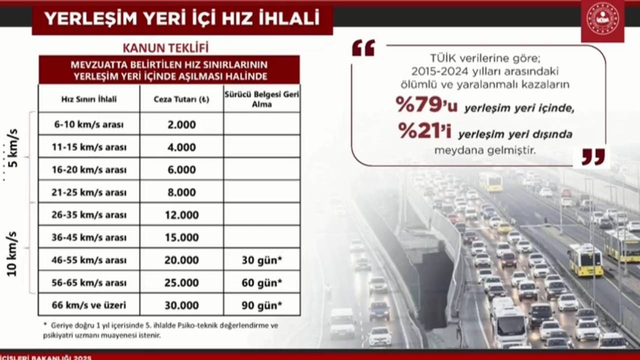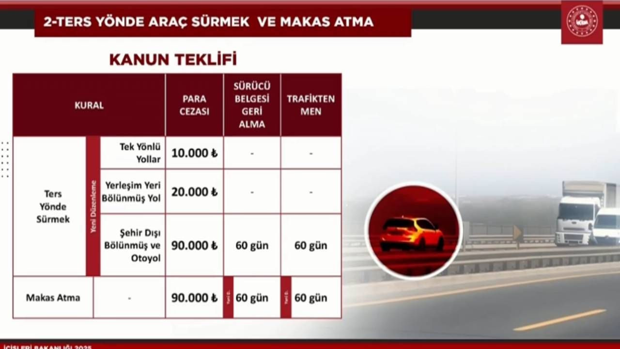 İçişleri Bakanı Ali Yerlikaya, trafikte caydırıcı cezaları içeren yasa tasarısının detaylarını açıkladı. Bakan Yerlikaya, yasa dışı çakar kullanan kişilerin ehliyeti ve aracının alınabileceğini aktardı. Yerlikaya yaka kameralarının tamamlandığını, yılbaşına kadar yunuslar ve önleyicilere kameraların takılacağını duyurdu. Ayrıca yeni uygulamayla birlikte makas atan sürücülerin para cezasının yanı sıra ehliyeti ve aracı da alınabilecek.