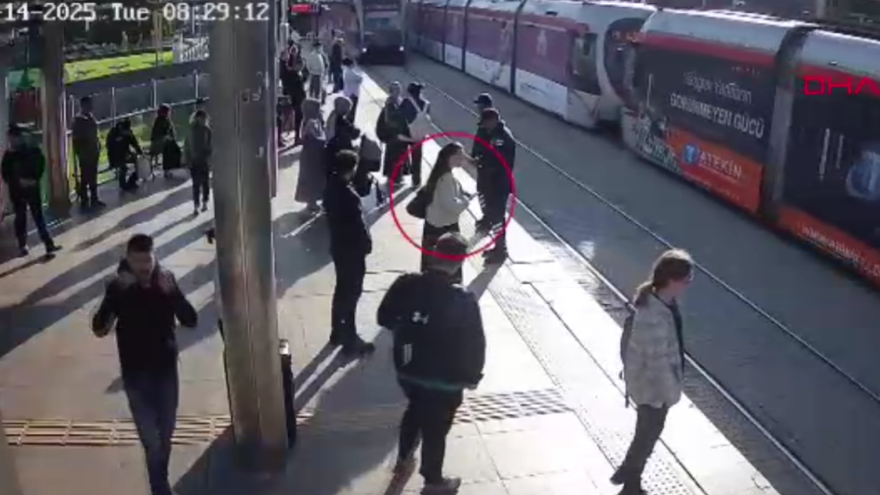 Olay, saat 08.30 sıralarında Cumhuriyet Meydanı tramvay durağında meydana geldi. Kulağında kulaklık, tramvayı fark etmeyip yolun karşısına geçmeye çalışan kadın yolcuyu güvenlik görevlisi kurtardı. O anlar güvenlik kamerasına yansıdı. Görüntülerde, yayanın kendisini kurtaran güvenlik görevlisinden özür dilediği duyuldu.