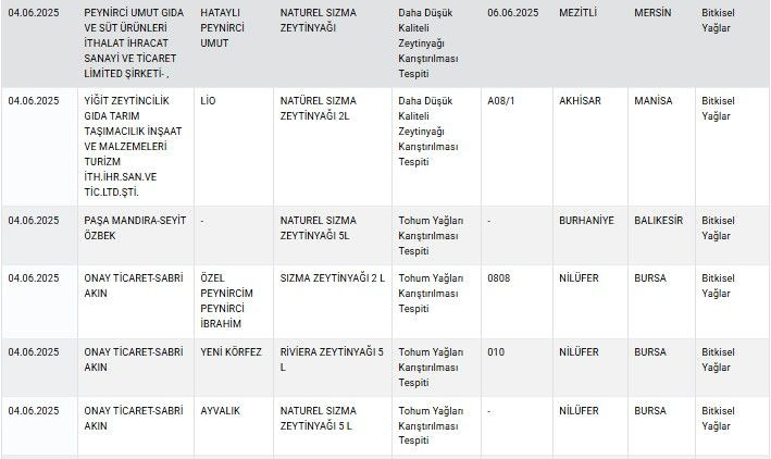 Aynı listede farklı markalara ait zeytinyağlarında yapılan hilelere de yer verildi. Listenin devamında Hatalı Peynirci Umut markası adı altında hizmet veren firmanın naturel sızma zeytinyağında daha düşük kaliteli zeytinyağının karıştırıldığı görüldü. Bursa'da Onay Ticaret firmasına ait farklı markaların zeytinyağlarından alınan örnekte tohum yağlarının karıştırıldığı görüldü.