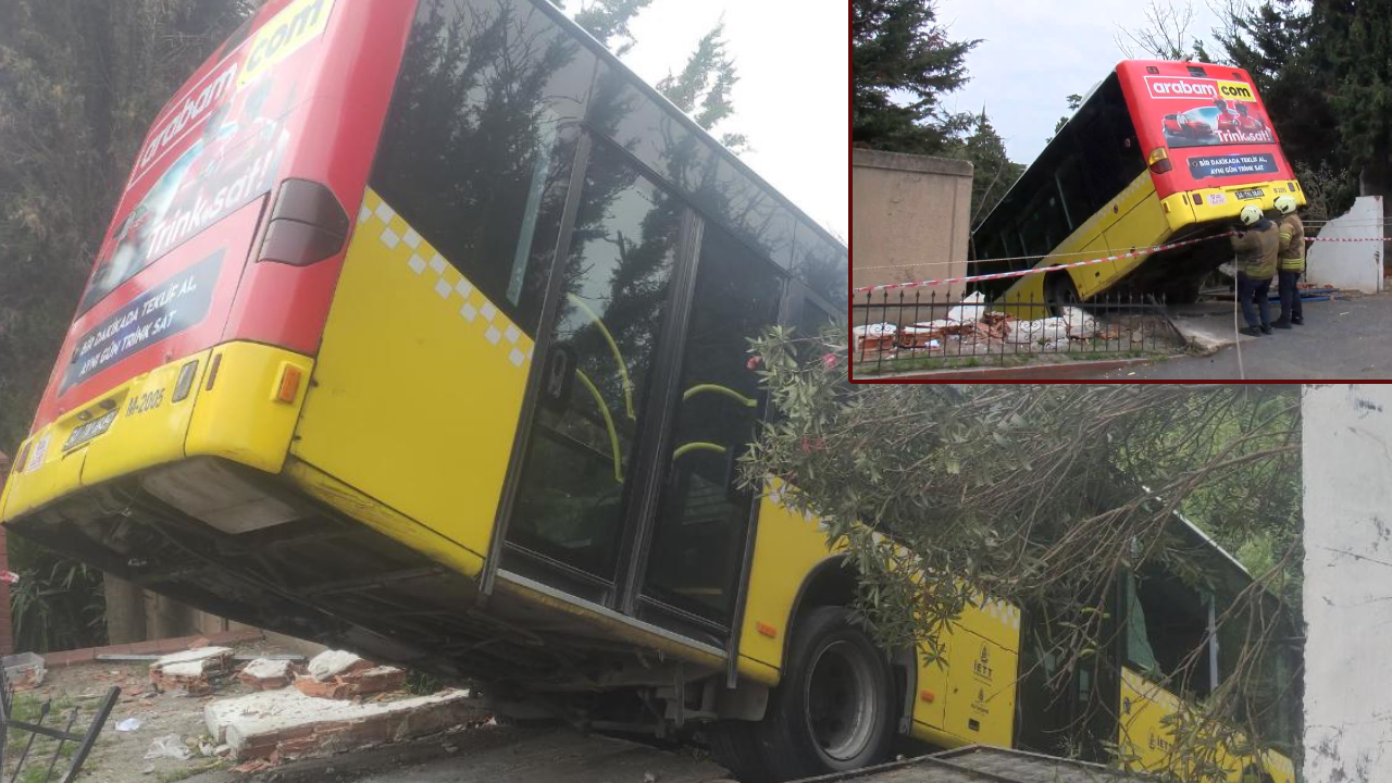 Üsküdar'da şoförünün el frenini çekmeden indiği öğrenilen otobüs, yokuşta kayarak kaza yaptı. İçerisinde yolcu bulunmayan otobüs, bahçe duvarına çarparak askıda kaldı. Ekiplerin olay yerindeki çalışması sürüyor. Kaza anı ise kameraya yansıdı.