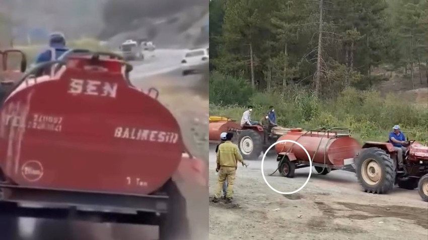Römorkunun arkasında 'Balıkesir' yazan bir çiftçinin tekerleğinin patlamış olmasına rağmen jant üzerine yangına su taşıdığı o anlar ise "Türk Halkı'nın müthiş dayanışması" başlığıyla sosyal medyada büyük ilgi gördü.