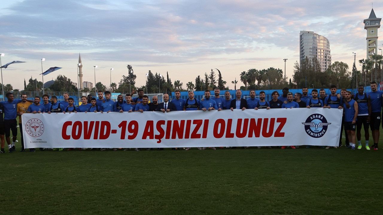 Bu kapsamda Adana İl Sağlık Müdürlüğü, kentin Süper Lig takımlarından Adana Demirspor’dan destek istedi. Bunun üzerine takım antrenmanı öncesi ellerindeki bilgendirici broşürlerle kamera karşısına geçen Kaan Kanak, Tarık Çamdal, Tayyip Talha Sanuç, Samet Akaydın, Matias Vargas, Younes Belhanda ve Gökhan İnler “Tedbirler ve aşıyla Kovid-19’u aşıyoruz” mesajı verdi. Daha sonra konuşan İl Sağlık Müdürü Halil Nacar, futbolculara teşekkür edip aşı çalışmalarının devam edeceğini söyledi.