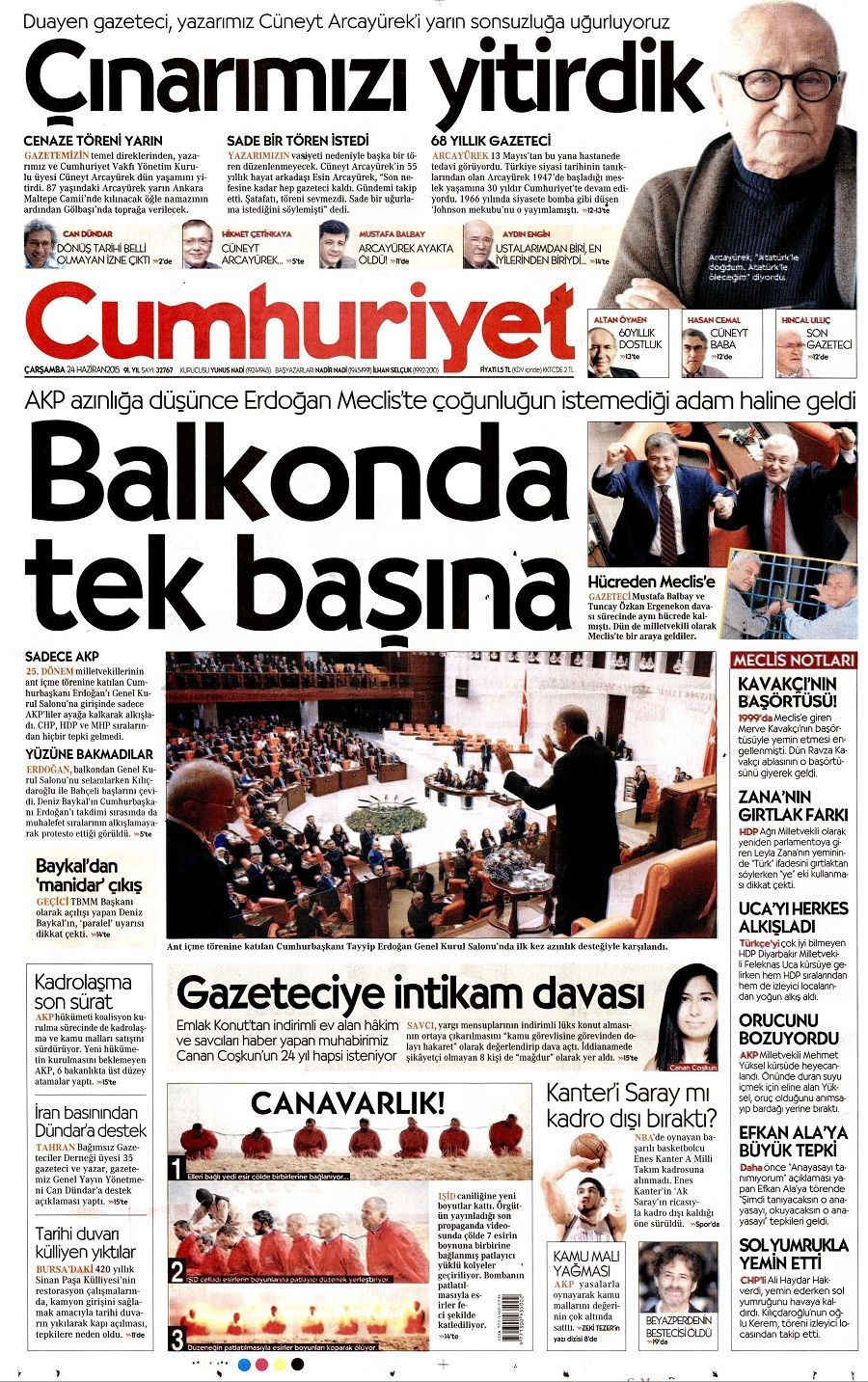 Cumhuriyet, Arcayürek'in ölümünü bugünkü sürmanşetten 'Çınarımızı yitirdik' başlığıyla duyurdu.