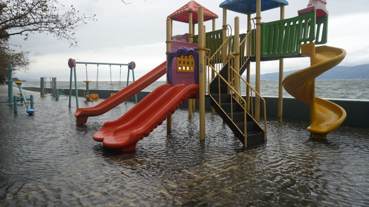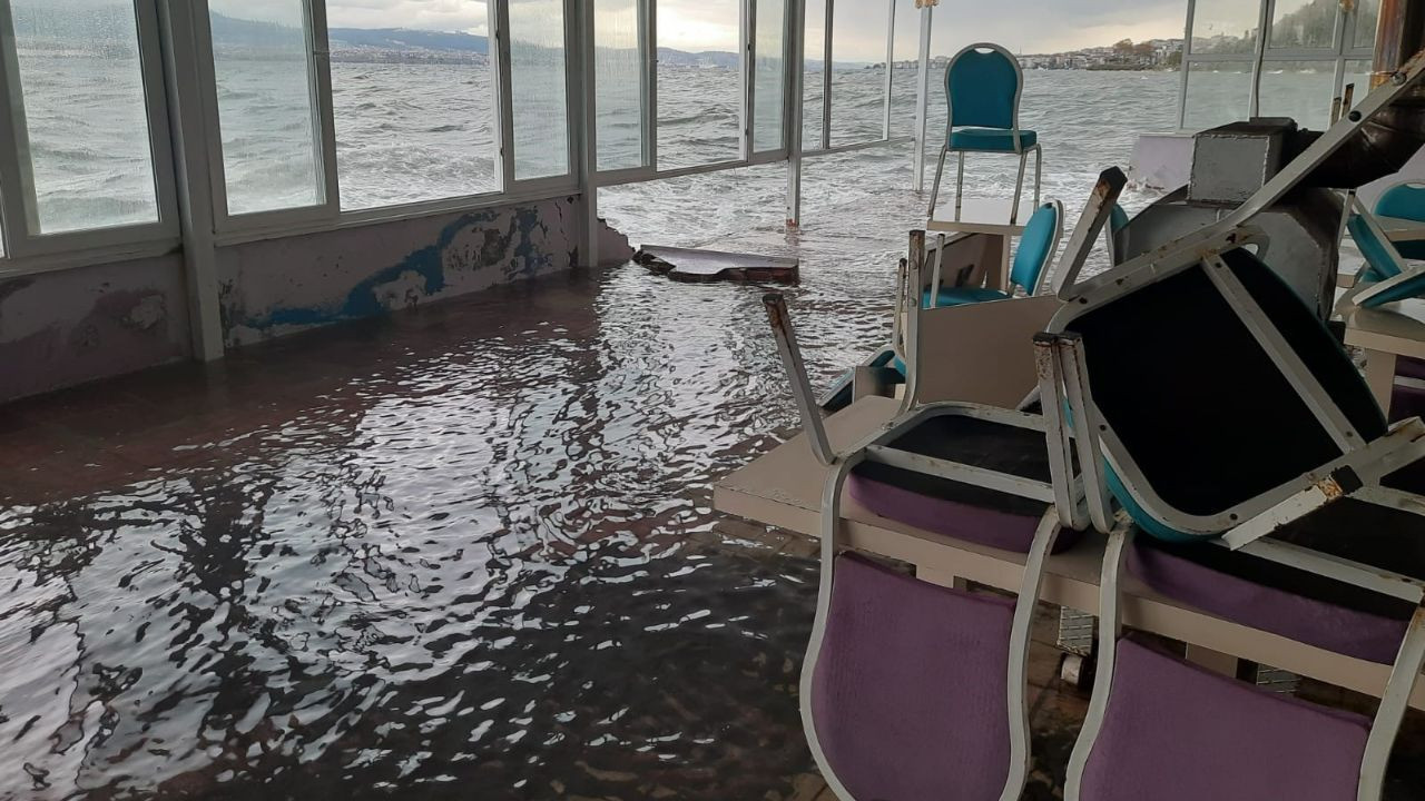 İzmit Körfez'ine kıyısı bulunan Gölcük ilçesi, denizden taşan dalgalar sebebiyle suyla kaplandı.