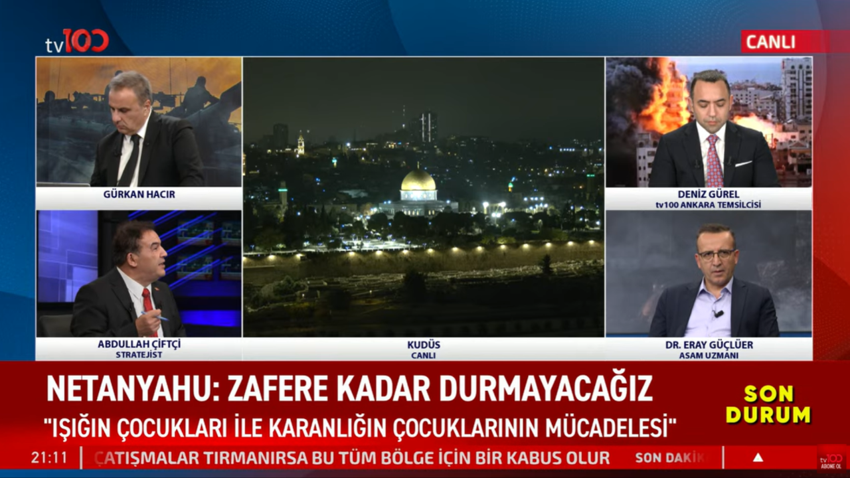 tv100.com yazarları Barış Yarkadaş, Fuat Uğur, tv100 Ankara Temsilcisi Deniz Gürel, stratejist Abdullah Çiftçi, İstanbul Aydın Üniversitesi Öğretim Üyesi Özgür Tör, Altınbaş Üniversitesi Öğretim Üyesi Dr. Eray Güçlüer, Gürkan Hacır ile Taksim Meydanı programına konuk oldu. 7 Ekim cumartesi günü başlayan İsrail ile Hamas arasındaki çatışmalar programda masaya yatırıldı.