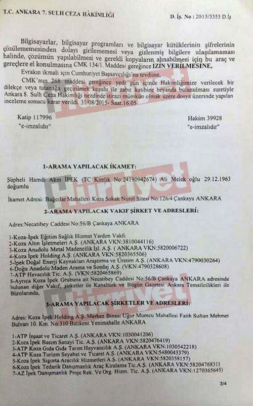 İşte, hakimin imzaladığı arama kararının 4 sayfalık tam metni: