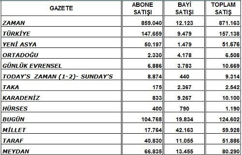 Gazetelerin karşılaştırmalı satış rakamları TİRAJ bölümündedir.