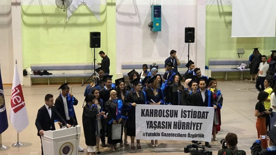 "Kahrolsun İstibdat Yaşasın Hürriyet – Tutuklu Gazetecilere Özgürlük" yazılı pankarta öğrencilerin aileleri alkışlayarak destek verdi.