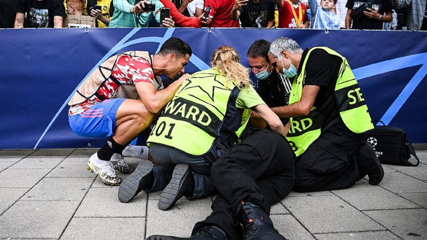Kale arkasında duran görevli, çarpmanın etkisiyle bayılırken, Ronaldo ve çevredekiler de panik yaşadı. Ronaldo'nun ilk müdahaleler yapılırken güvenlik görevlisinin başından ayrılmadığı görüldü.