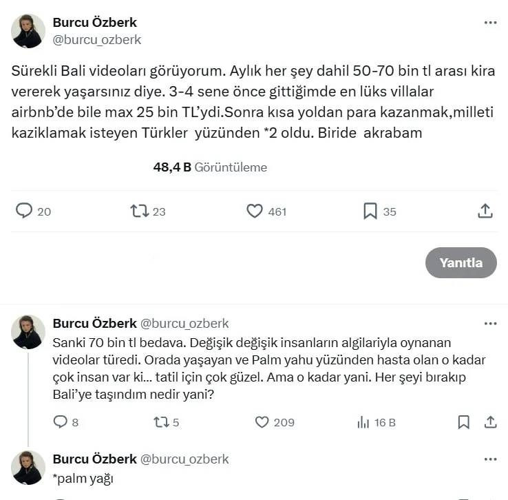 Özberk, paylaşımında "Sürekli Bali videoları görüyorum. 'Aylık her şey dahil 50-70 bin TL arası kira vererek yaşarsınız' diye. 3-4 sene önce gittiğimde en lüks villalar Airbnb'de bile maksimum 25 bin TL'ydi. Sonra kısa yoldan para kazanmak, milleti kazıklamak isteyen Türkler yüzünden 2 katı oldu. Biri de akrabam" diye yazdı.