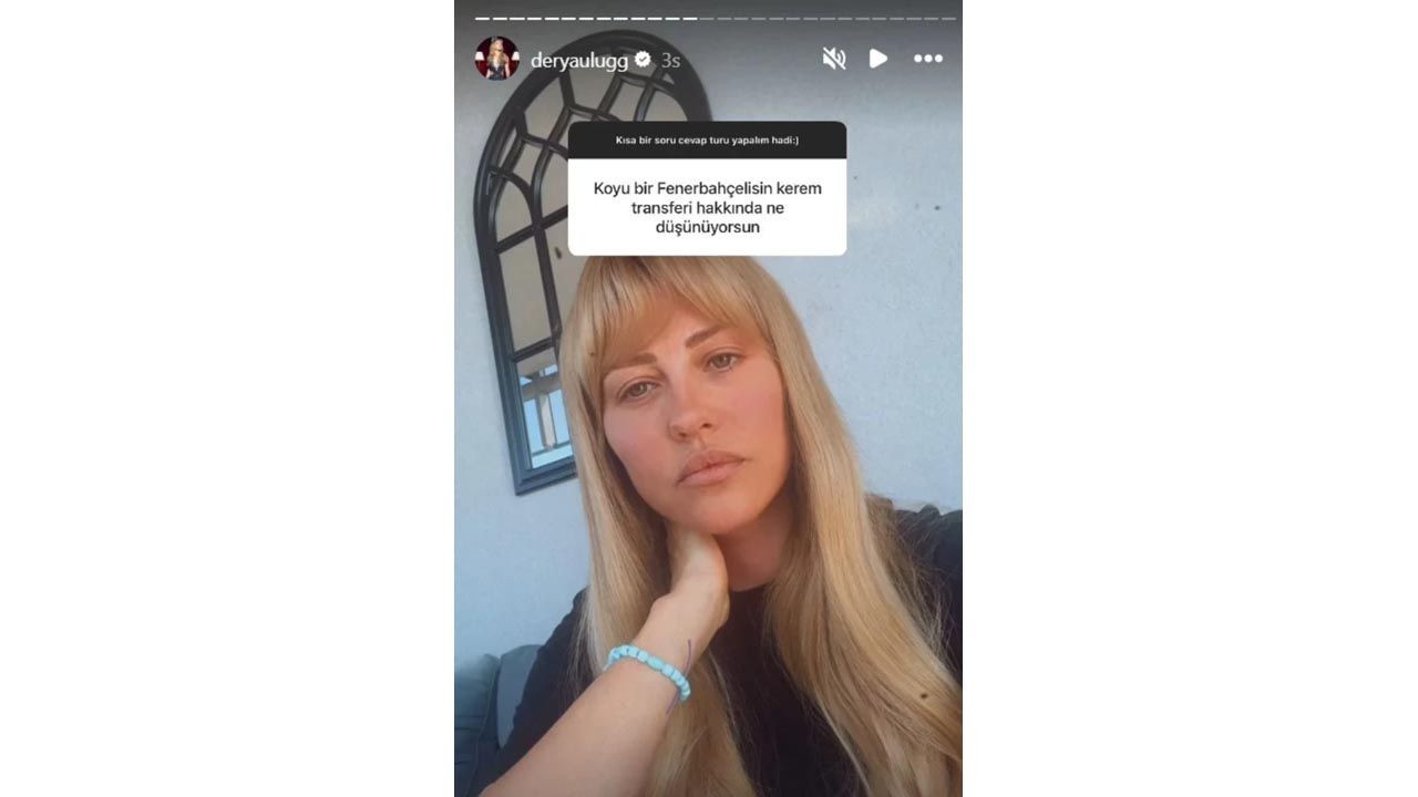 Ünlü şarkıcı Derya Uluğ, sosyal medya üzerinden gerçekleştirdiği soru - cevap etkinliğinde, "Koyu bir Fenerbahçelisin, Kerem transferi hakkında ne düşünüyorsun?" sorusuna yanıt verdi.