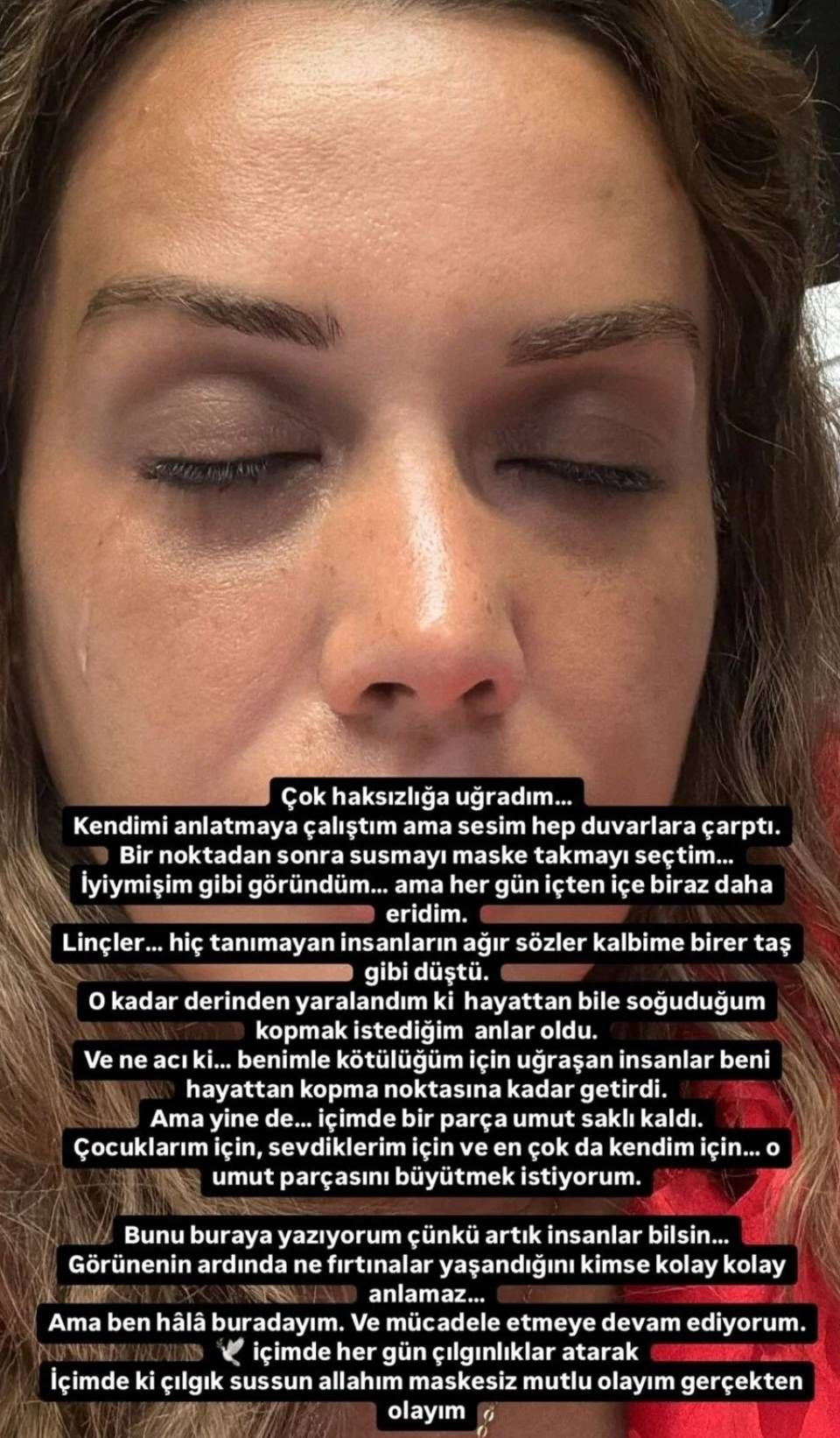 "Çok haksızlığa uğradım. Kendimi anlatmaya çalıştım ama sesim hep duvarlara çarptı. Bir noktadan sonra susmayı maske takmayı seçtim. İyiymişim gibi göründüm ama her gün içten içe biraz daha eridim. Linçler... Hiç tanımayan insanların ağır sözler kalbime birer taş gibi düştü.