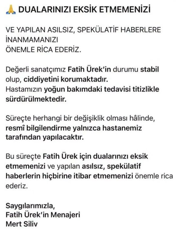 “Değerli sanatçımız Fatih Ürek'in durumu stabil olup, ciddiyetini korumaktadır. Hastamızın yoğun bakımdaki tedavisi titizlikle sürdürülmektedir.