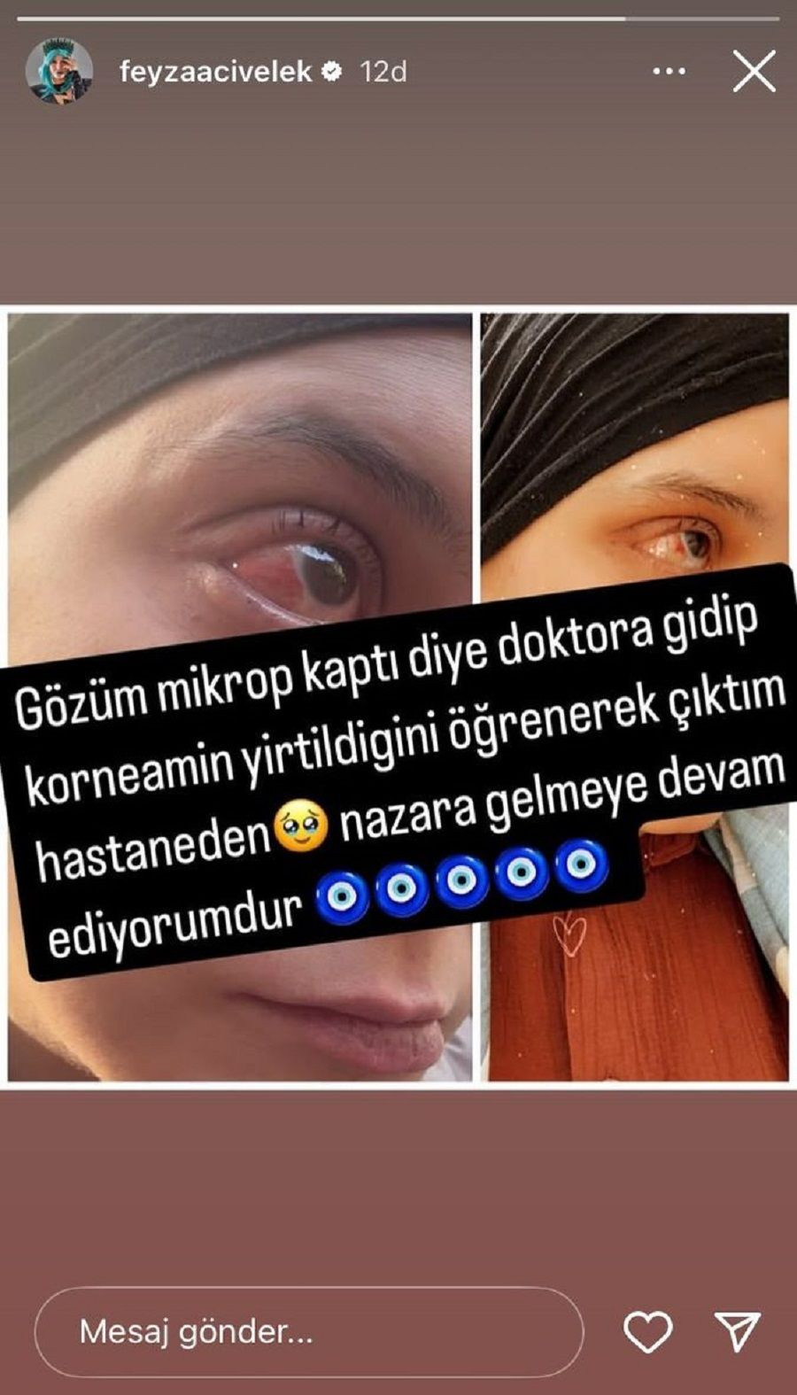 Instagram hesabından gözünün fotoğrafını paylaşan oyuncu; "Gözüm mikrop kaptı diye doktora gidip, korneamın yırtıldığını öğrenerek çıktım hastaneden. Nazara gelmeye devam ediyorumdur" mesajını yayımladı.