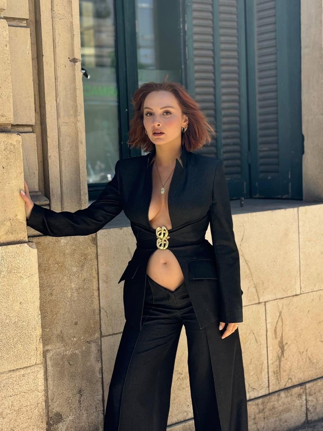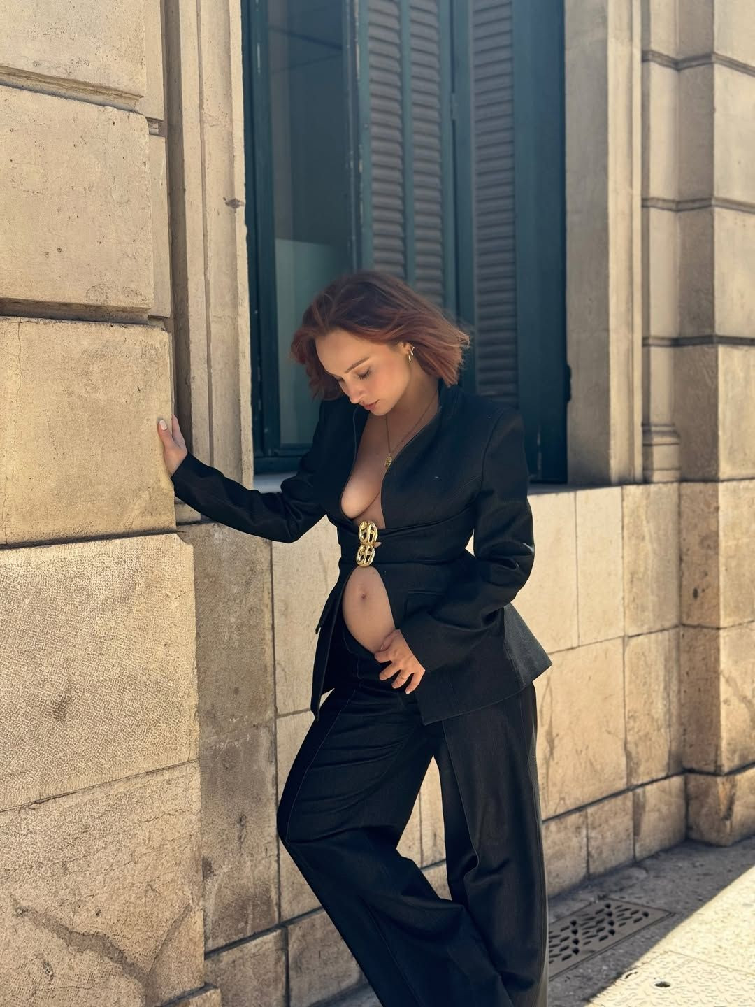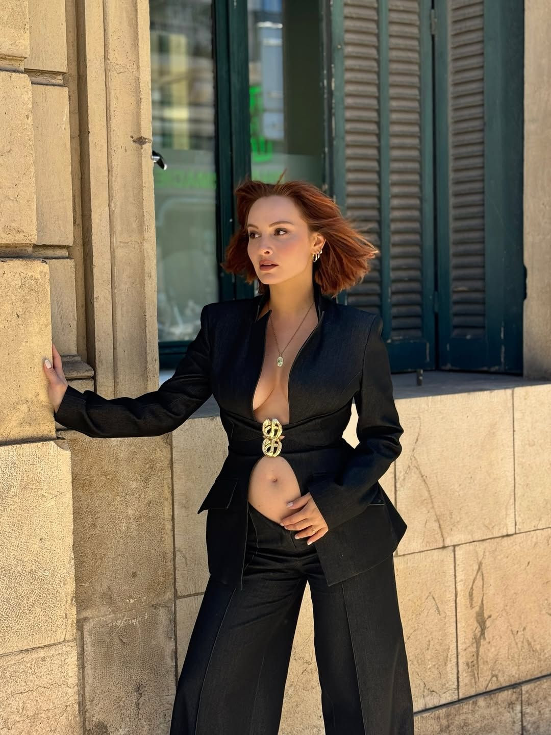 Karnı belirginleşen güzel oyuncu, göbeğini açıkta bırakan siyah kombiniyle objektif karşısına geçti.