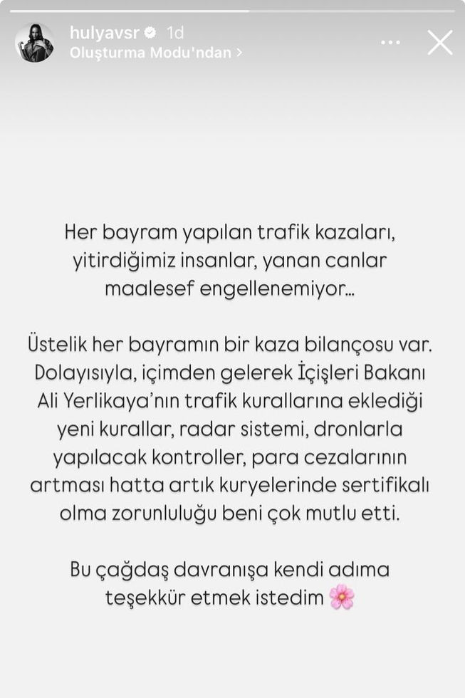 Avşar; "Her bayram yapılan trafik kazaları, yitirdiğimiz insanlar, yanan canlar maalesef engellenemiyor... Üstelik her bayramın bir kaza bilançosu var. Dolayısıyla, içimden gelerek İçişleri Bakanı Ali Yerlikaya'nın trafik kurallarına eklediği yeni kurallar, radar sistemi, dronlarla yapılacak kontroller, para cezalarının artması hatta artık kuryelerinde sertifikalı olma zorunluluğu beni çok mutlu etti. Bu çağdaş davranışa kendi adıma teşekkür etmek istedim" açıklamasını yaptı.