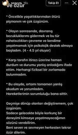 "Öncelikle yaşattıklarımdan ötürü pişmanım ve çok üzgünüm. Olayın sonrasında, davranış bozukluklarımı gidermek ve bu tür rahatsızlıkları çevreme ve kendime yaşatmamak için psikolojik destek almaya başladım. (4 - 4.5 yıl oluyor) Karşı tarafın itirazı üzerine hemen durdum ve durumu yanlış anladığımı ifade ettim. Herhangi fiziksel bir zorlamada bulunmadım. Bu olayda, ortamı tamamen yanlış okudum ve yorumladım. Hareketlerimin sorumluluğu bana aittir. Geçmişe dönüp olanları değiştiremem, çok üzgünüm. Sadece gelecekte böyle korkunç bir deneyimi kimseye yaşatmayacağımın sözünü verebilirim. Beni seven ve sevmeyen herkesten tekrar özür dilerim."
