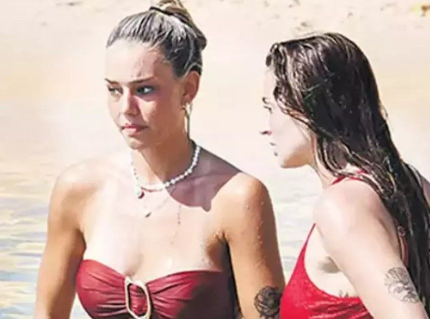 Yağmur Banda, yüzerken bir anda mayosunun ipliği açılınca zor anlar yaşadı. Eliyle mayosunun ipini bağlamaya çalışırken imdadına arkadaşı yetişti.