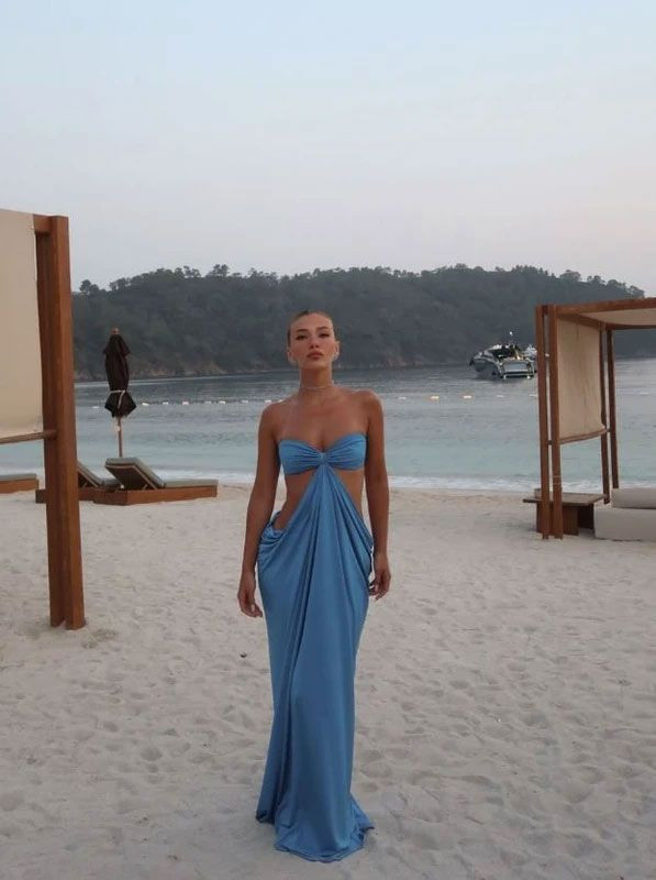 Gün batımı eşliğinde, bembeyaz kumlar üzerinde objektif karşısına geçen güzel oyuncu, mavi derin dekolteli elbisesiyle mest etti.
