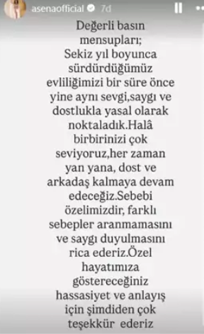 "Sekiz yıl boyunca sürdürdüğümüz evliliğimizi bir süre önce yine aynı sevgi, saygı ve dostlukla yasal olarak noktaladık. Hala birbirimizi çok seviyoruz, her zaman yan yana, dost ve arkadaş kalmaya devam edeceğiz. Sebebi özelimizdir, farklı sebepler aranmamasını ve saygı duyulmasını rica ederiz.
