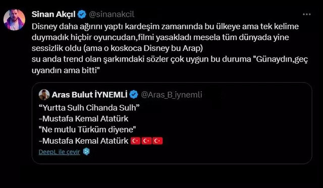 Akçıl, "Disney daha ağırını yaptı kardeşim zamanında bu ülkeye ama tek kelime duymadık hiçbir oyuncudan filmi yasakladı mesela tüm dünyada yine sessizlik oldu (ama o koskoca Disney bu Arap) şu anda trend olan şarkımdaki sözler çok uygun bu duruma 'Günaydın, geç uyandın ama bitti'" dedi.