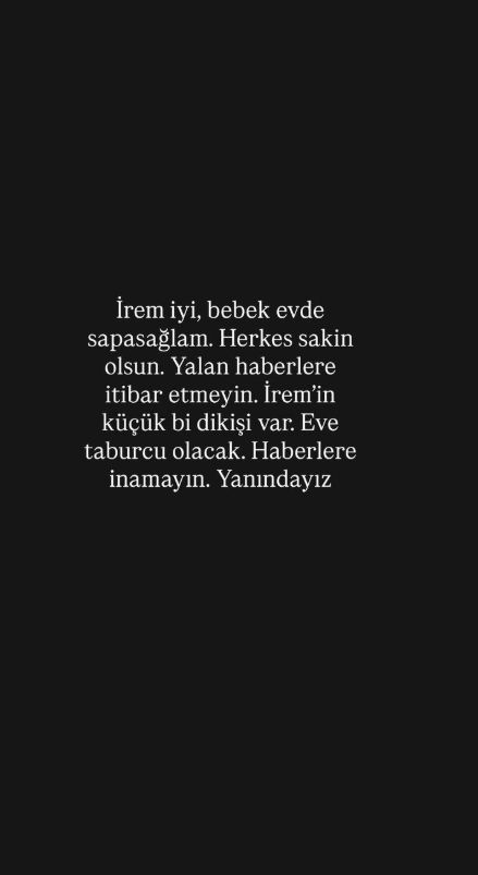 Sebile Ölmez, Helvacıoğlu'nun sağlık durumu ve çıkan haberler hakkında bir açıklama yaptı. Yapılan açıklamada; "İrem iyi, bebek evde sapasağlam. Herkes sakin olsun. Yalan haberlere itibar etmeyin. İrem’in küçük bir dikişi var, taburcu olacak. Haberlere inanmayın, yanındayız."