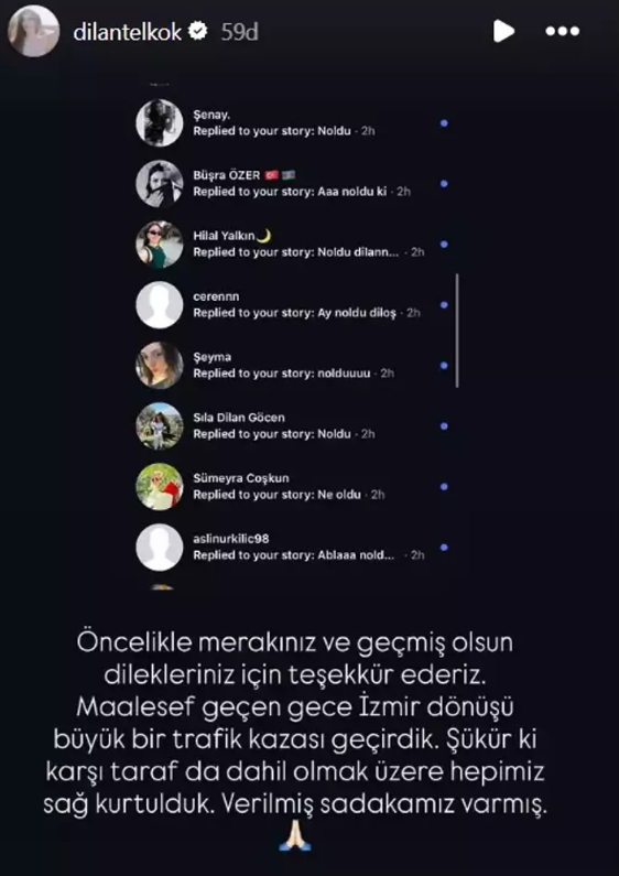 Sosyal medyayı aktif kullanan Dilan Telkök ile Berkay Hardal çiftinin trafik kazası geçirdiği ortaya çıktı. Uzun süredir paylaşım yapmayan ve takipçilerinin sorularına yanıt veren Dilan Telkök şu ifadeleri kullandı: