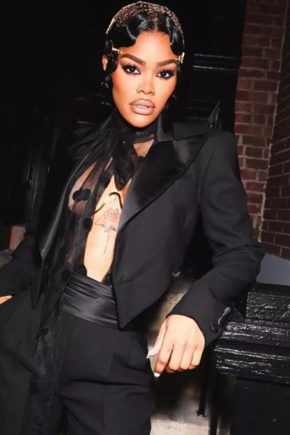 Teyana Taylor, siyah bir takım elbise içine puantiyeli tülden bir gömlek giydi. Gömleğinin düğmelerini açıkta bırakan Teyana Taylor bu haliyle bakana bir daha baktırdı.