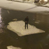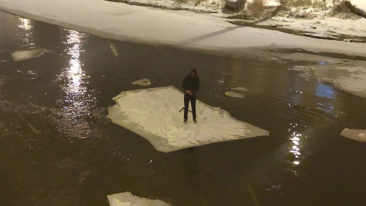 Bayburt’ta kısmen donan Çoruh Nehri'ndeki buz kütlesini kıran Burak Yılmaz, 15 santimetre kalınlığındaki parçayı sal gibi kullanıp, 200 metre ilerledi.