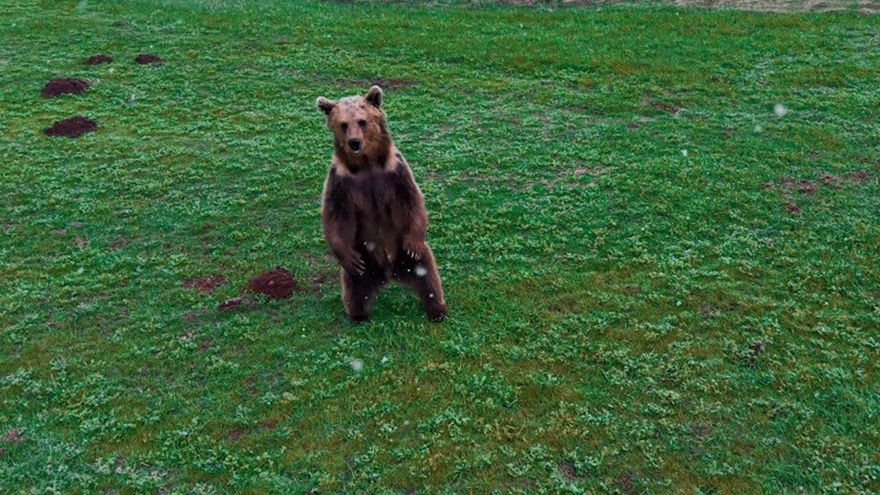 Belgesel niteliğinde bir süre havadan görüntülenen ayının iki ayağının üzerine kalkıp droneye tepki göstermesi de kadraja yansıdı.