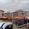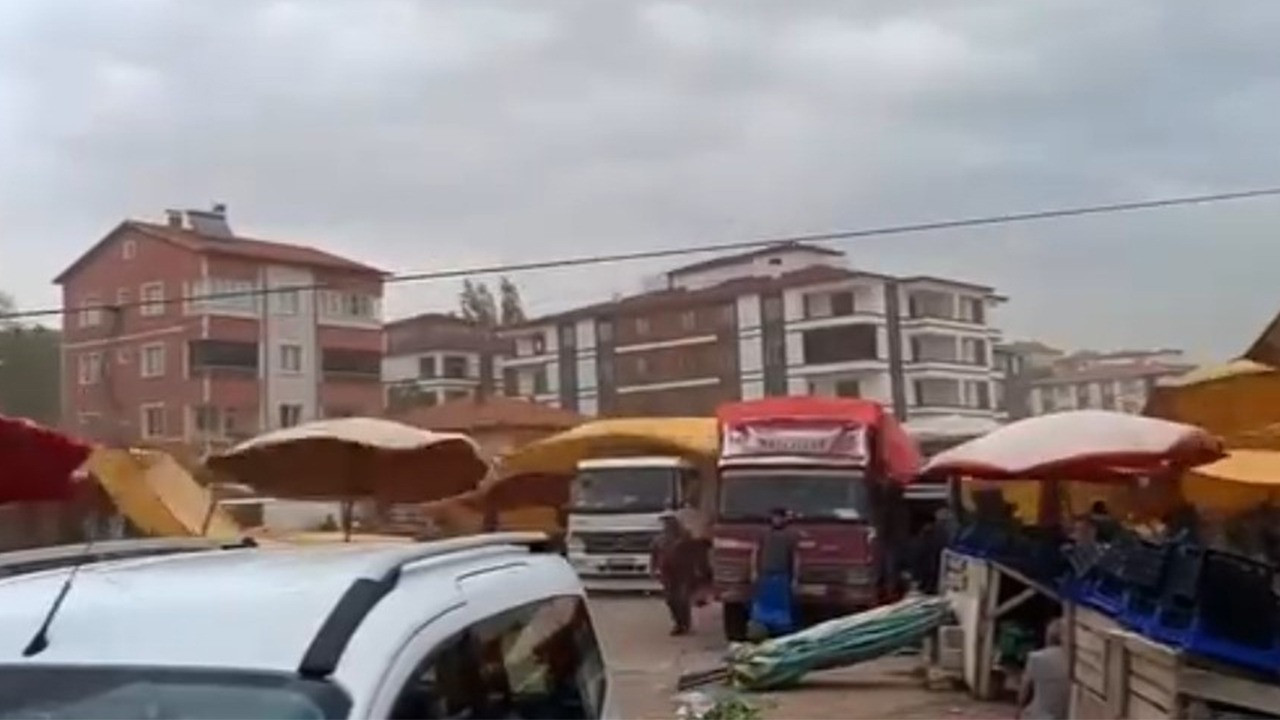 Yozgat'ın Sarıkaya ilçesinde etkili olan fırtına, ilçede kurulan semt pazarında etkili oldu. Alışveriş yapmak için pazara giden vatandaşlar fırtınanın etkisini göstermesiyle zor anlar yaşadı. Pazardaki şemsiyelerin uçtuğu anlar cep telefonu kamerasıyla görüntülendi.