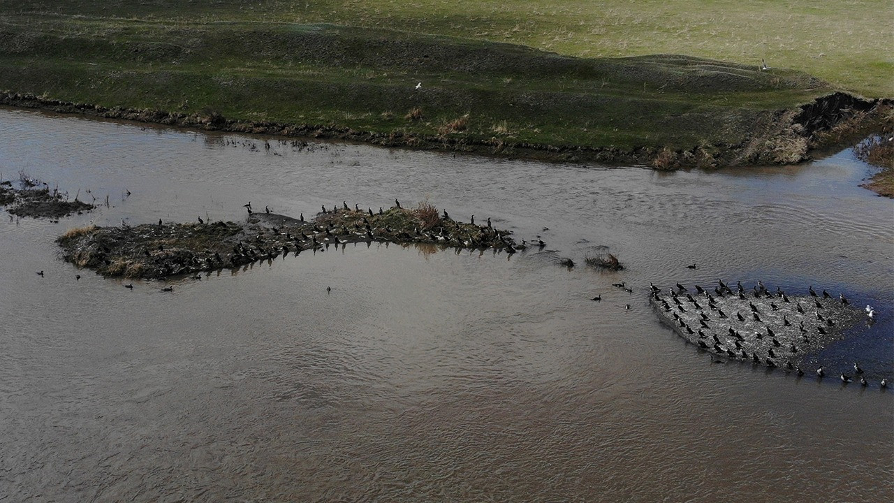 Kars'a gelirken yorgun düşen ve Kars Çayı'nda oluşan adacıklarda dinlenen karabataklar, havadan görüntülendi.