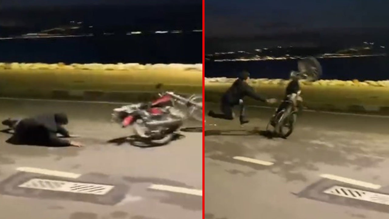 Edinilen bilgiye göre, Ereğli Sahili'nde bir genç, motosikletiyle seyir halindeyken ön tekeri kaldırarak ilerlemeye çalıştı. Ancak dengesini kaybederek motosikletten düşen genç, asfalt zemine savruldu. Olay anı çevredeki bir kişi tarafından cep telefonuyla saniye saniye kaydedildi.