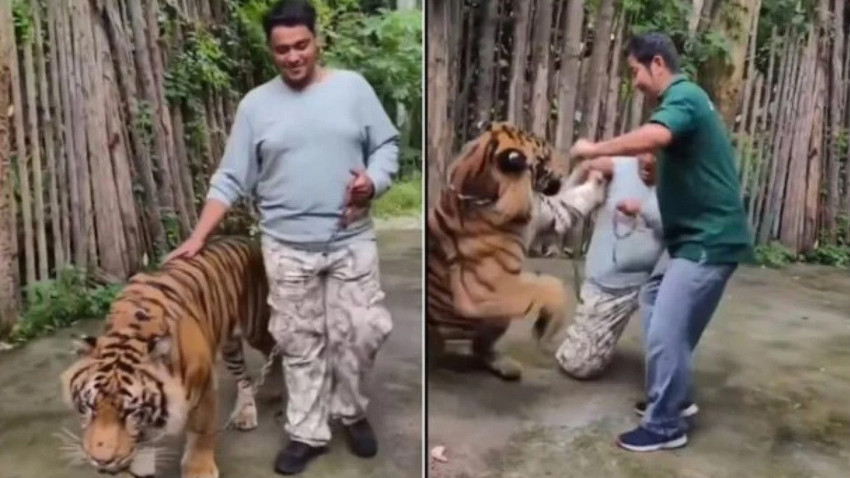 Olay anı, sosyal medya platformu X’te paylaşılan bir video ile hızla yayıldı. Videoda, turistin zincirle kontrol ettiği kaplanla birlikte yürüdüğü görülüyor. Ancak selfie çekmeye çalıştığı sırada kaplan bir anda saldırıya geçiyor. Görüntülerde ayrıca bir görevlinin turisti kurtarmaya çalıştığı anlar ve panik dolu çığlıklar yer alıyor. Eğitmenlerden biri elindeki sopa ile kaplana oturması yönünde işaret vermeye çalışıyor ancak birkaç saniye içinde kaplan saldırıya geçiyor ve ortamda büyük bir panik yaşanıyor.