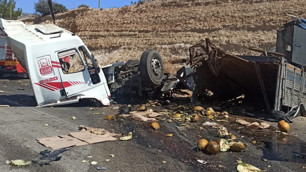 Henüz sürücüleri ve plakaları belirlemeyen yolcu otobüsü ile kavun yüklü kamyon çarpıştı.
