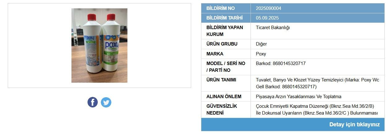 81 ilde denetimler aralıksız sürerken, uygunsuzluk tespit edilen ürünler de kamuoyu ile paylaşılıyor. Bakanlığın son duyurusu 5 Eylül tarihinde geldi. "Poxy" marka tuvalet, banyo ve klozet yüzey temizleyicisi olarak satılan ürünün satışı yasaklandı.