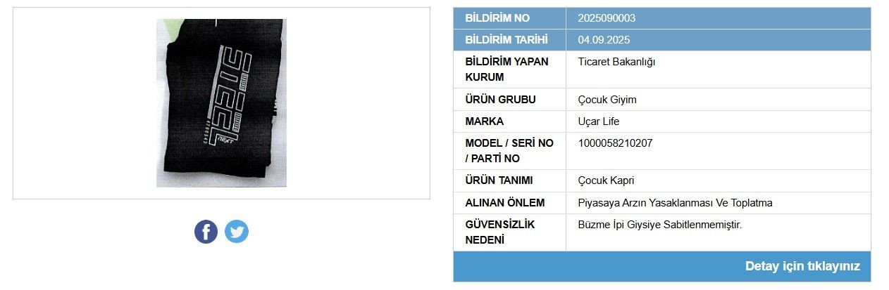 Listeye ayrıca 4 Eylül 2025 tarihinde de çocuk giyim ürünü eklendi. Uçar Life markasına ait çocuk kıyafetinin taşıdığı boğulma ve yaralanma riski nedeniyle satışı yasaklandı.