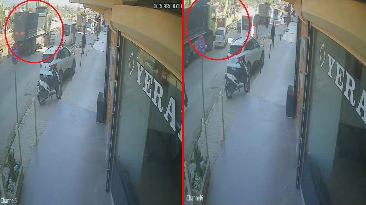 Hatay'da hafriyat kamyonunun kör noktasına gelen otomobilin oyuncak araba gibi sürüklendiği anlar güvenli kamerasına yansıdı. Kamyon sürücüsünün kazanın ardından durmadan yoluna devam etmesi şoke etti.