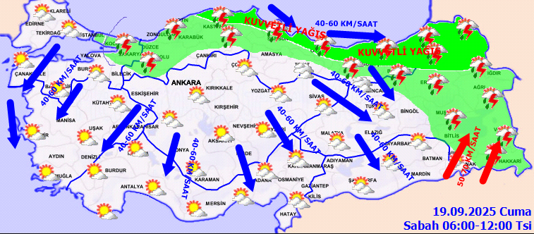 Yağışların; Karadeniz kıyıları, Doğu Anadolu’nun kuzeydoğusu ve Artvin çevrelerinde yerel kuvvetli olması bekleniyor. Rüzgarın; Marmara’nın güneyi, Ege, Akdeniz’in iç kesimleri, İç Anadolu’nun güney ve doğusu ile Doğu Anadolu’nun batısında kuzeyli yönlerden, Doğu Anadolu’nun güneydoğusunda güneyli yönlerden kuvvetli (40-60 km/saat); Orta ve Doğu Karadeniz kıyılarında ise kuvvetli ve yer yer fırtına (50-70 km/sa) olarak esmesi bekleniyor.