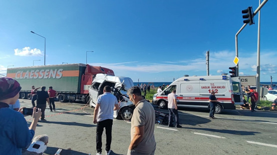 Kazada, önünde bekleyen hafriyat kamyonun ile TIR arasında sıkışan minibüsteki 15 kişi yaralandı. İhbar üzerine kaza yerine polis, itfaiye ve sağlık ekipleri sevk edildi. Ekipler tarafından minibüsten çıkarılan yaralılar, ambulanslarla çevre hastanelere kaldırıldı.