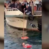 Çevredeki vatandaşlar da can simidi atarak, kadına yardım etmeye çalıştı. Suya atlayan kişi, kadın yolcuyu yakaladı. Ardından can simidi takılan yolcu bir tekneye çıkarıldı.